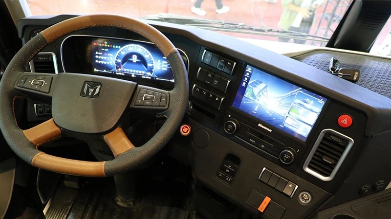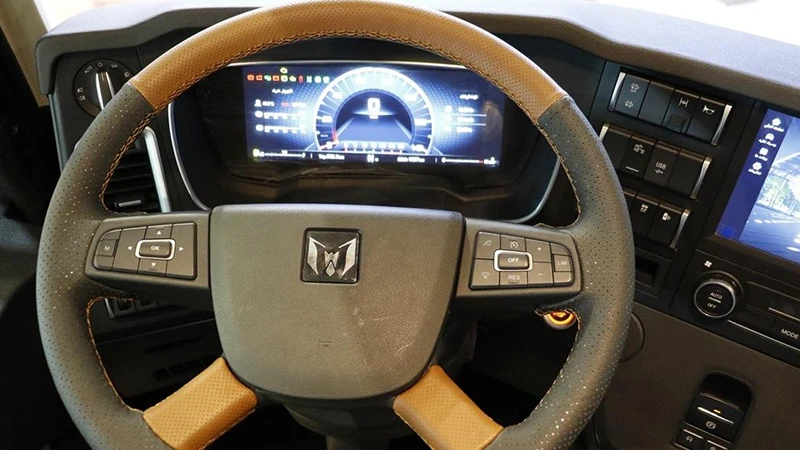 همانطور که گفتیم فضای داخلی کشنده T-MARK با تمرکز بر راحتی راننده و سرنشینان طراحی شده است. در نگاه نخست، چینش منظم ادوات، ارتفاع مناسب کابین و حذف پالونی وسط باعث میشود رفتوآمد درون کابین بسیار آسان باشد. فرمان D-CUT با کلیدهای کنترلی و صفحه نمایش دیجیتال پشت آن، اطلاعات ضروری را در اختیار راننده قرار میدهد. طراحی ارگونومیک صندلیها و میدان دید گسترده نیز در کنار شیشه جلو با زاویه مناسب، حس اطمینان و تسلط بیشتری به راننده میدهد.