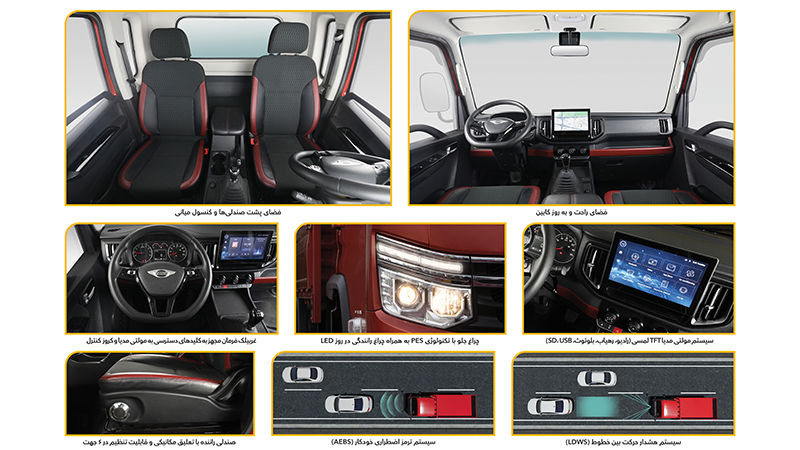 | تجهیزات | سیستم هشدار برخورد از جلو (FCW) – ترمز اضطراری خودکار (AEBS) – هشدار حرکت بین خطوط (LDWS) – سیستم کنترل سرعت در سربالایی (HSA) – صندلی راننده با تعلیق مکانیکی و امکان تنظیم در ۶ جهت – کروز کنترل – دوربین دید عقب، آلارم دنده عقب – سیستم مولتی مدیای TFT لمسی (دارای رادیو، رهیاب، بلوتوث، SD، USB) – فرمان مجهز به کلیدهای کنترلی سیستم مولتی مدیا و کروز کنترل – چراغ جلو با تکنولوژی PES – چراغ رانندگی در روز LED (DRL) – روشنایی خودکار چراغها (Auto Light) – چراغهای مهشکن عقب و جلو – قفل مرکزی به همراه ریموت کنترل – شیشه بالابر برقی – آینههای جانبی برقی به همراه گرمکن – سیستم تهویه مطبوع اتوماتیک – کیف ابزار – جک بالابر – حفاظ جانبی |