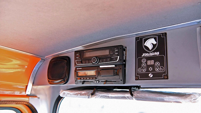 | تجهیزات | سیستم هشدار انحراف از مسیر (LDWS)، آفتابگیر داخلی، کولر و بخاری، بخاری درجا، صندلی راننده و کمک راننده قابل تنظیم و مجهز به کمربند ایمنی سه نقطه، گرمکن صندلی راننده، چراغهای مه شکن جلو و عقب، چراغ روشنایی در روز، بوق برقی و بوق دنده عقب، قفل عرضی دیفرانسیل، گارد جلو، عقب و جانبی، سیستم صوتی شامل رادیو، SD Card USB AUX و دو عدد بلندگو، سیستم ترمز مجهز به فیلتر رطوبتگیر، لجنگیر اتوماتیک. |