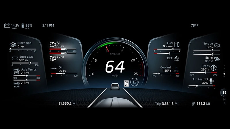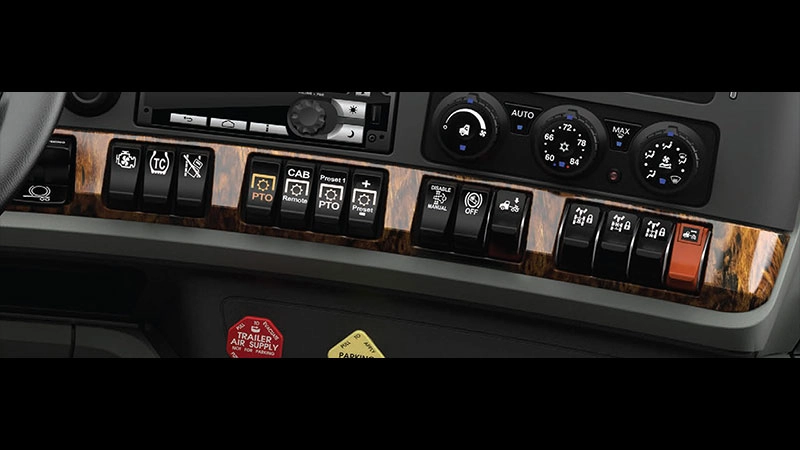 KENWORTH T880 از امکانات فنی خاصی برخوردار است که آن را از رقبا متمایز میکند. سیستم TruckTech+ یکی از این ویژگیهاست که اطلاعات لحظهای از بخشهای مختلف کامیون را پایش کرده برای تعمیرگاهها و مدیر ناوگان ارسال میکند تا از خرابیهای ناگهانی جلوگیری شود. همچنین این مدل به سامانه NAV+ HD با نمایشگر دیجیتال، ناوبری پیشرفته و سیستم بلوتوث مجهز شده که تجربهای مدرن از رانندگی را فراهم میآورد. وجود آینههای برقی گرمکندار، چراغهای LED جلو، سنسورهای اطراف و سیستم کنترل هوشمند راننده در کنار فرمان چندکاره SmartWheel، از جمله دیگر تجهیزات فنی قابلسفارش در این کامیون حرفهای است.