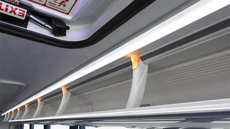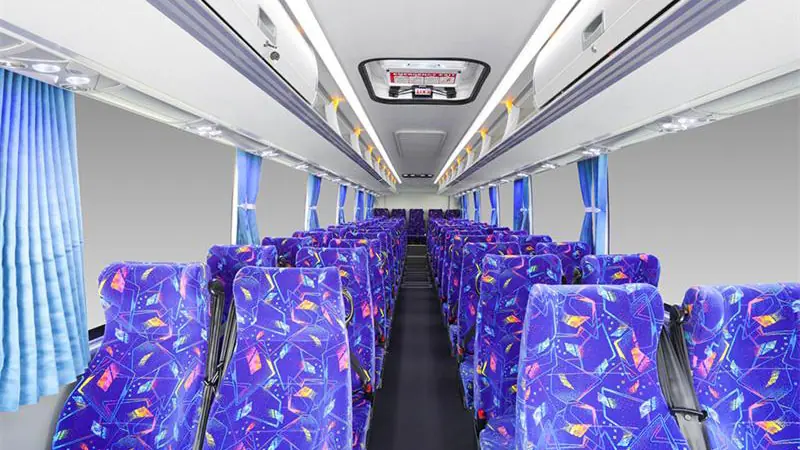 در نمای داخلی اتوبوس King Long 12-13m 59/63 seats Large Luxury Coach نیز از متریالها و موادی استفاده شده که کیفیت بالایی دارند و اجزای سیستم نورپردازی داخلی نیز تماماً از تولیدات برندهای معتبر هستند. جانمایی درست صندلیها، باعث شده فضای کافی برای هر مسافر تأمین شود.