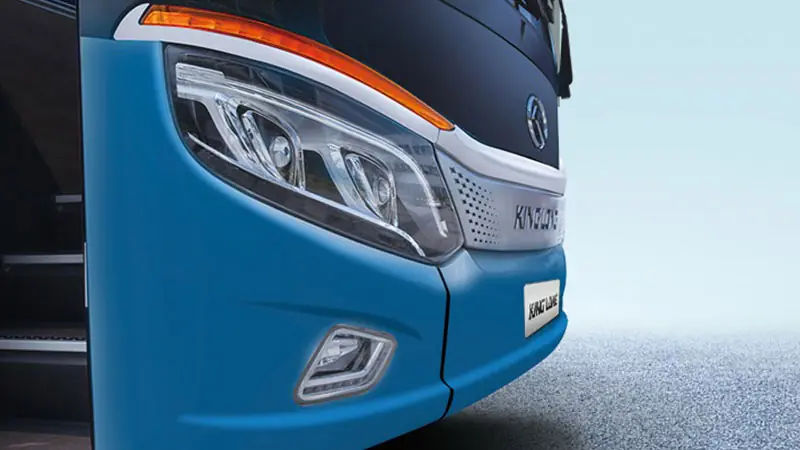اتوبوس King Long Long Distance Large Coach 57/61 Seats در طراحی بدنه، ترکیبی از فرم آیرودینامیک و خطوط بدنه منظم را به نمایش میگذارد. امتداد یکپارچه شیشه جلو تا کنارهها، جلوهای نوین و حرفهای به آن داده و بهواسطه همین طراحی، میدان دید راننده بهبود یافته است. چراغهای اصلی با شکل کشیده و دیلایتهای LED، عملکرد روشنایی مناسبی دارند.