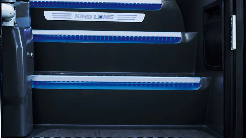 اتوبوس King Long Long Distance Large Coach 57/61 Seats با جانمایی اصولی صندلیها، راهرو مرکزی را باز و قابلعبور نگه داشته و بهرهگیری از سیستم روشنایی غیرمستقیم در سقف، محیطی دلپذیر در شب فراهم میکند. طراحی درهای ورودی نیز بهگونهای است که سوار و پیادهشدن مسافران بهراحتی و بدون مشکل انجام میگیرد.