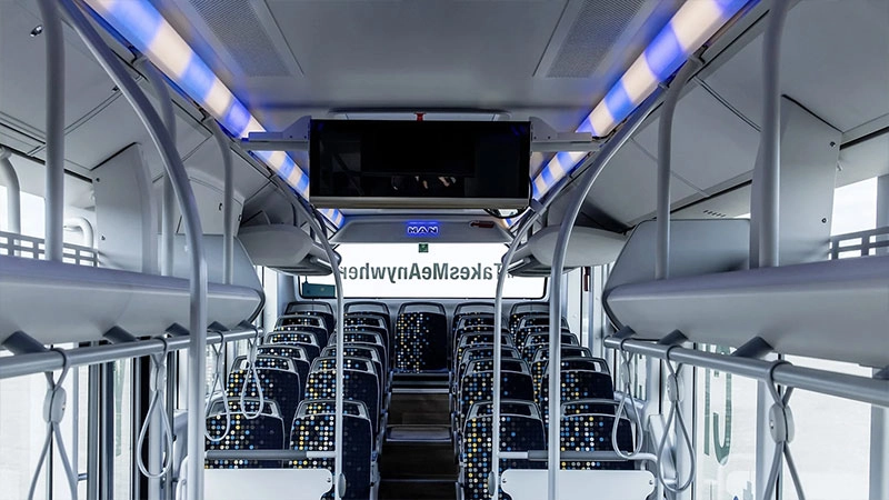در بخش داخلی نیز، به جزئیات اهمیت ویژه‌ای داده شده است. اتوبوس MAN Lionʼs Intercity LE با فضای داخلی روشن، صندلی‌های ارگونومیک و چیدمان منظم، محیطی دلپذیر برای مسافران فراهم می‌آورد. استفاده از مواد اولیه باکیفیت و رنگ‌بندی متناسب، جلوه‌ای امروزی به فضای داخلی بخشیده است که با سایر المان‌های طراحی هماهنگی دارد.