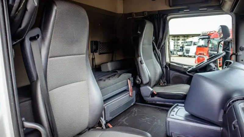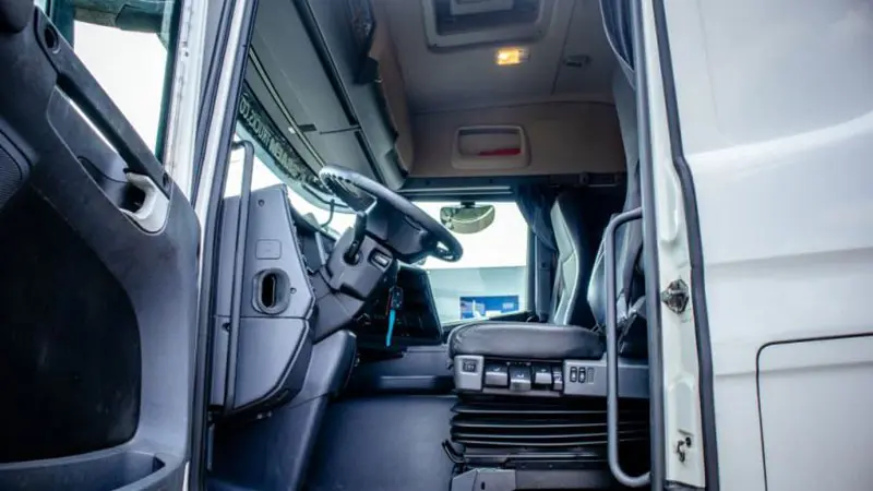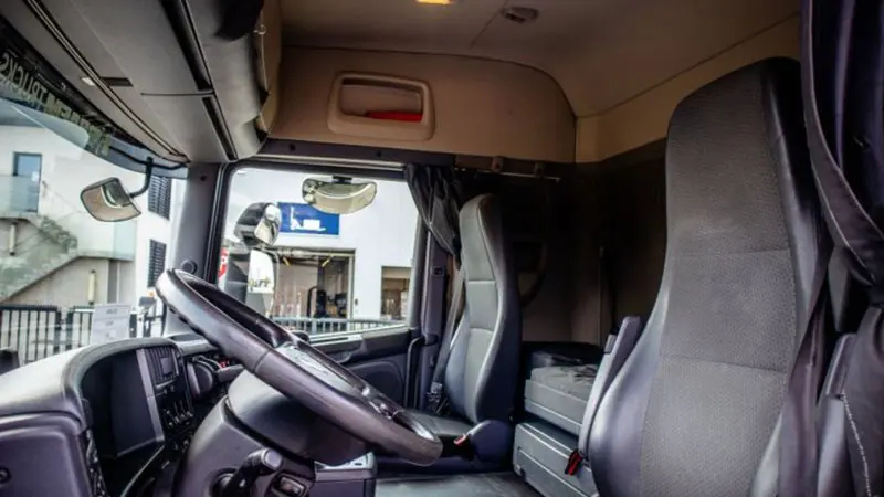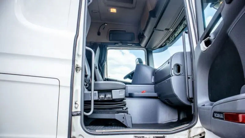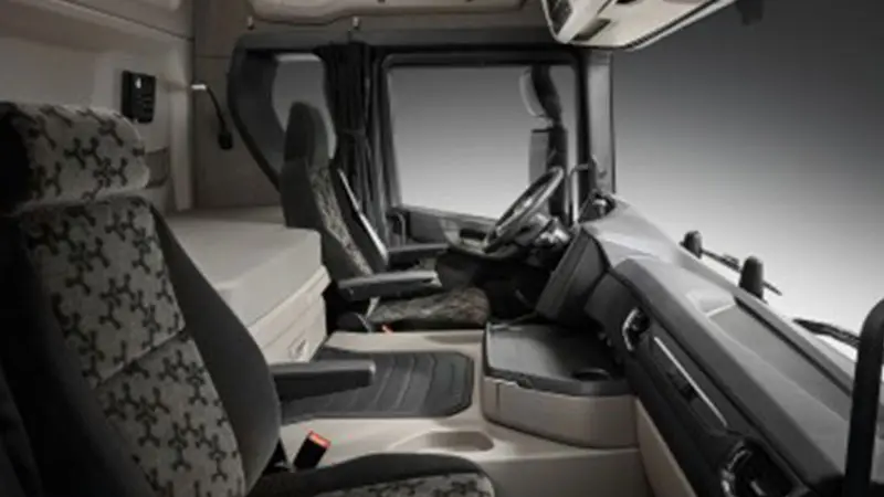 در داخل نیز با یک کابین سقف بلند روبهرو هستیم، راننده بهراحتی میتواند در این کابین جابهجا شده و حتی داخل آن بایستد. وجود فضاهای متعدد ذخیرهسازی و جای خواب نیز فضای داخل این کابین را متمایز کرده است. طراحی داشبورد، فرمان و صندلیهای این کامیون همگی از استانداردهای همیشگی اسکانیا تبعیت میکنند.
