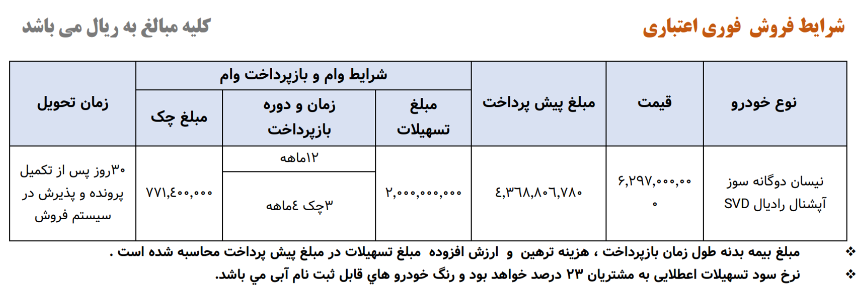فروش فوری اعتباری نیسان تکسوز آپشنال رادیال SVPDH و نیسان آپشنال رادیال دوگانه سوز SVPDH از ساعت 12 روز دوشنبه مورخ 1404/03/19 از طریق سایت فروش اینترنتی آغاز شده و تا تکمیل ظرفیت فروش ادامه دارد. کلیه مبالغ درج شده در جدول زیر به ریال میباشد. مبلغ بیمه بدنه در طول زمان بازپرداخت، هزینه ترهین و ارزش افزوده مبلغ تسهیلات در مبلغ پرداخت محاسبه شده است. نرخ سود تسهیلات اعطایی به مشتریان 23 درصد میباشد.