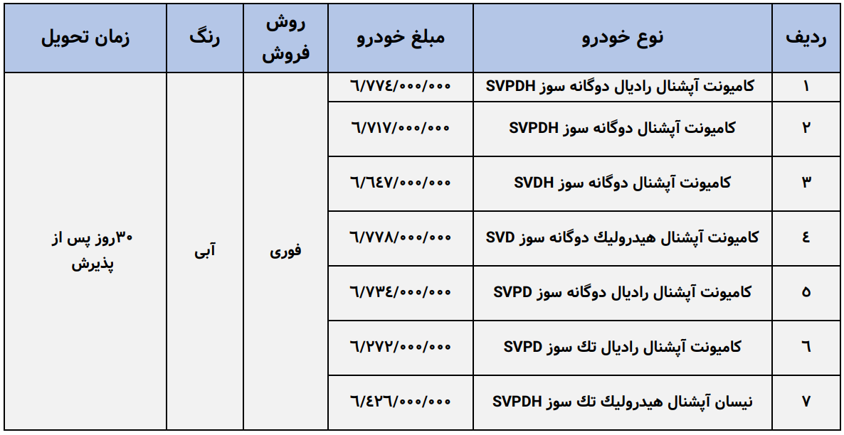 | 1 | نیسان تکسوز آپشنال رادیال SVPHD | 7.892.470.000 | فوری | 1404 | آبی | 30 روز پس از پذیرش |